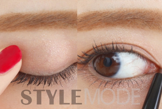STEP 1:用带珠光的咖啡色眼影点在眼皮上作为打底,再用手指吧眼影轻轻延伸到整个眼窝,眼神就变得深邃又神秘。