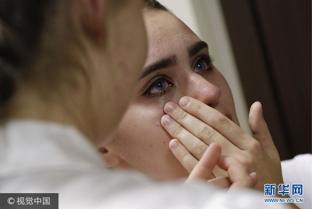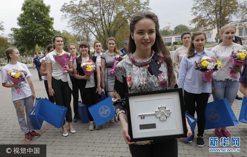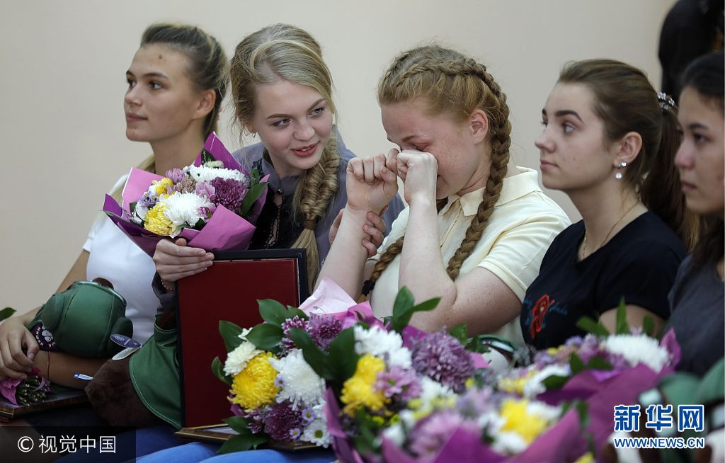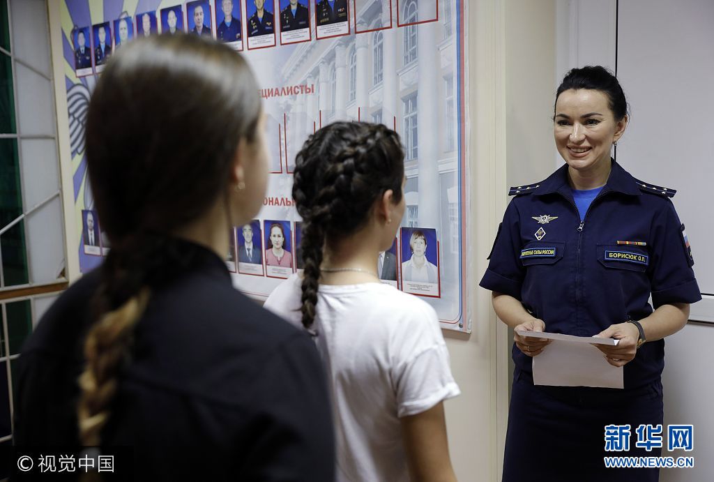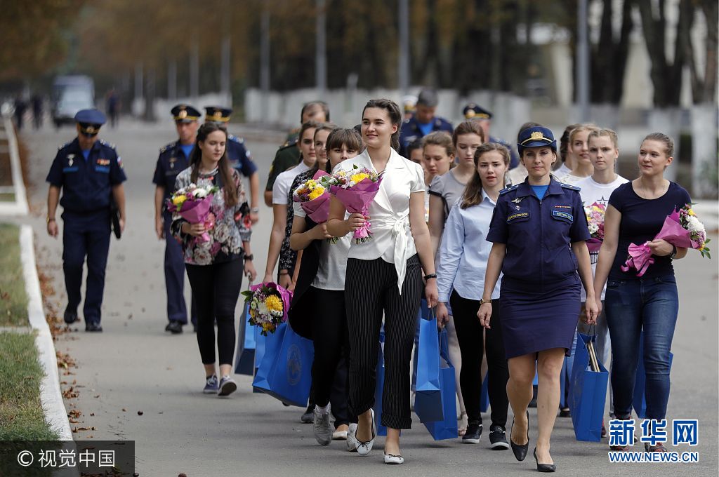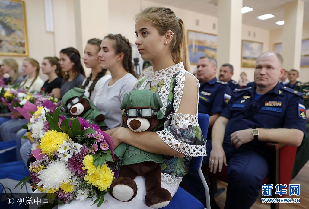当地时间2017年9月23日,俄罗斯克拉斯诺达尔,俄罗斯克拉斯诺达尔高级军事航空学校招收女飞行学员,被录取女飞行学员参加仪式心情激动。图片来源:视觉中国