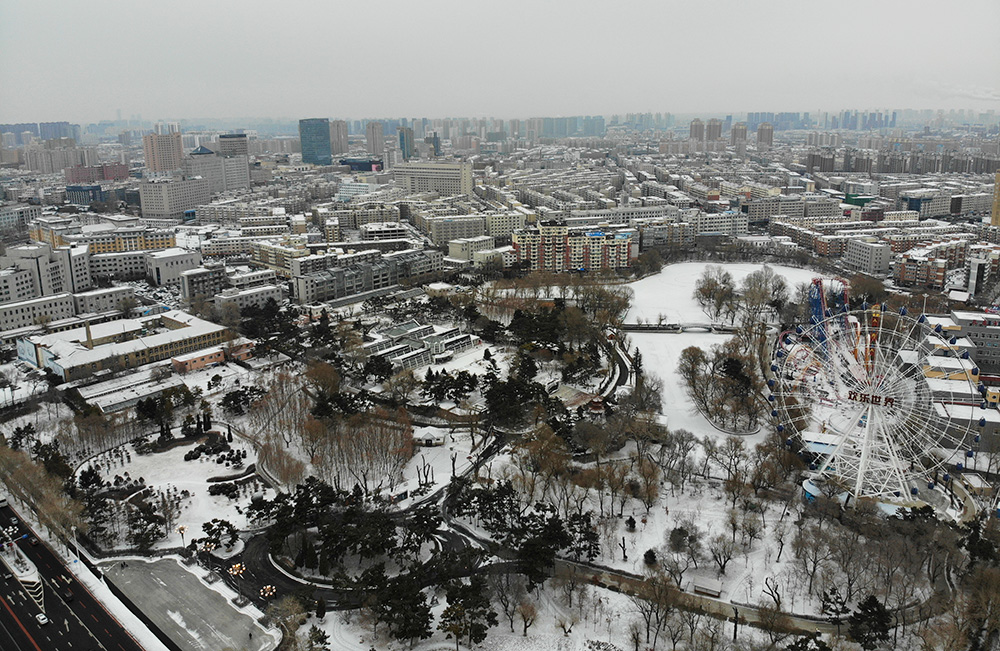 无人机航拍-雪后的长春市儿童公园。 新华网 邵守志摄