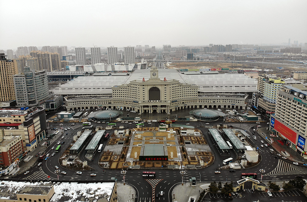 无人机航拍-雪后的长春火车站。 新华网 邵守志摄