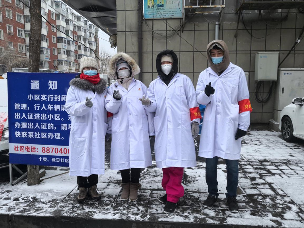 长春市二道区东站街道十委社区工作人员在雪天坚持做好疫情防控工作。 新华网 康世奇摄
