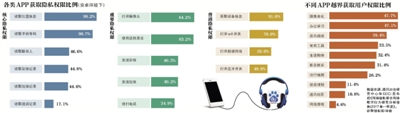 记者梳理发现,在安卓系统手机中,应用索取最多的几个权限分别为“读取本机识别码”、“读取已安装应用列表”、“读取位置信息”、“调用摄像头”、“悬浮窗”和“启用录音”六项。