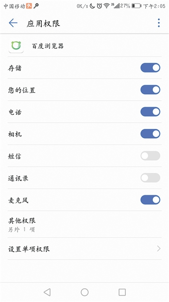 当记者允许这两款应用获得位置权限及存储权限后,两个应用可正常使用。但记者在手机的“应用权限”一栏中发现,除经记者同意开启存储和位置权限外,百度浏览器还自动开启了相机权限、电话权限以及麦克风权限;在“单项权限”一栏中,其开启的权限还包括调用摄像头、启用录音、获取浏览器上网记录。手机百度则自动开启了通讯录权限和电话权限,“单项权限”中开启的权限包括读取本机识别码、读取联系人以及应用自动启动等。事实上,上述权限记者均未在打开应用时授权,属于应用“暗中开启”。