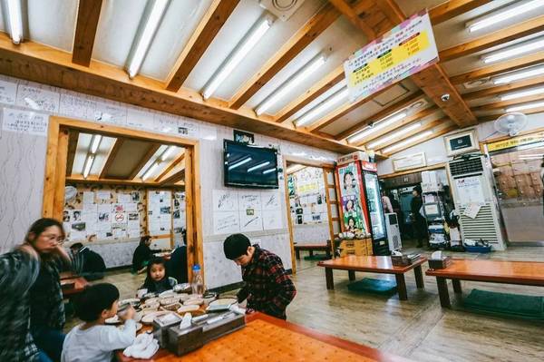 星彩盘是庆州非常有名的韩定食专营店。韩定食,就是大大小小的碟子塞满一桌的韩国风格餐品。一般中间有个主菜:炒肉或者炖锅,在四周再搭配满满一圈配菜,除了有常见的白菜和茼蒿之外,还有苏子叶,菠菜,芹菜叶,牛蒡叶等等。在传统韩国定食的基础上,拿着叶子包着菜或者饭吃,就变成了所谓的菜包饭,是韩国特有的饮食文化之一。
