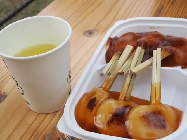 园内还有茶屋,这里可以品尝鹿儿岛的名小吃两棒饼,茶是免费的。两根竹签插着一个年糕团子,硬币大的小饼经过烧烤后,用两根竹签串起来,配以黄酱和黑糖熬干后的甜酱或味增酱,别具风味。