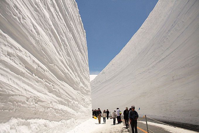 “立山黑部阿尔卑斯山脉路线”是穿越日本北阿尔卑斯山的一条全长90公里的旅游路线。即使过了5月,仍有很大的积雪量。