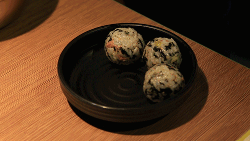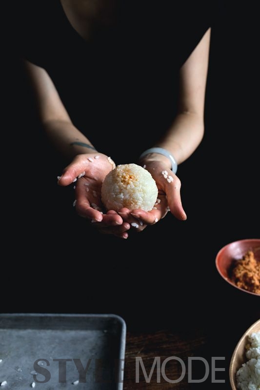 4、取适量大米饭放在保鲜膜上,包起来做成一个小圆球,再用手捏捏实;
