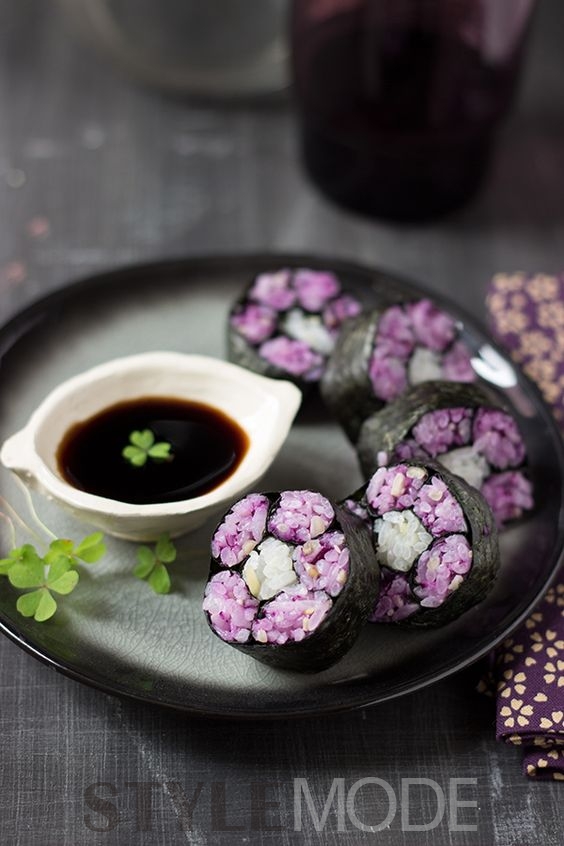 5、利刀沾凉开水快速切开,摆放盘中,鱼子酱、青芥辣和淡口酱油作为蘸料,也可以把沙拉酱直接挤在紫菜卷上食用。
