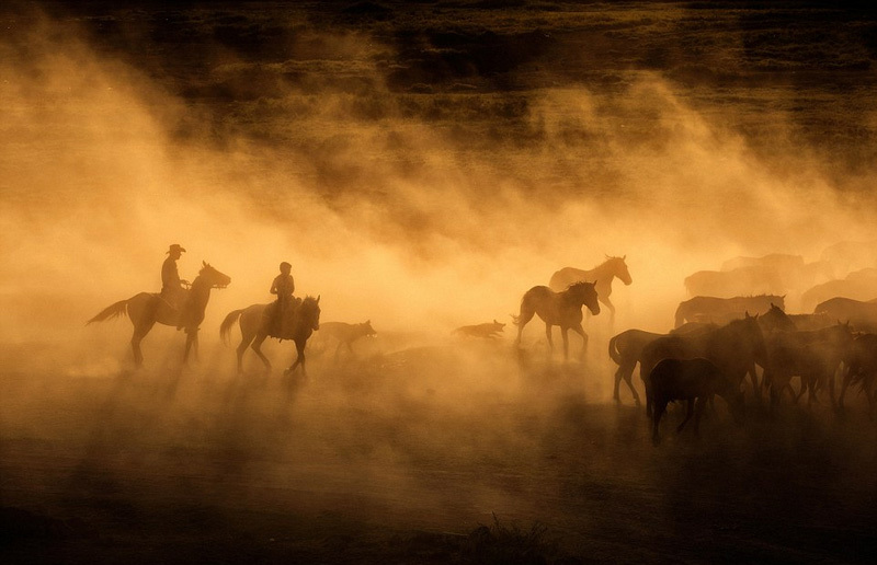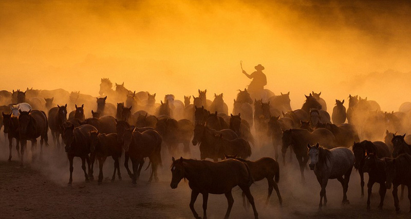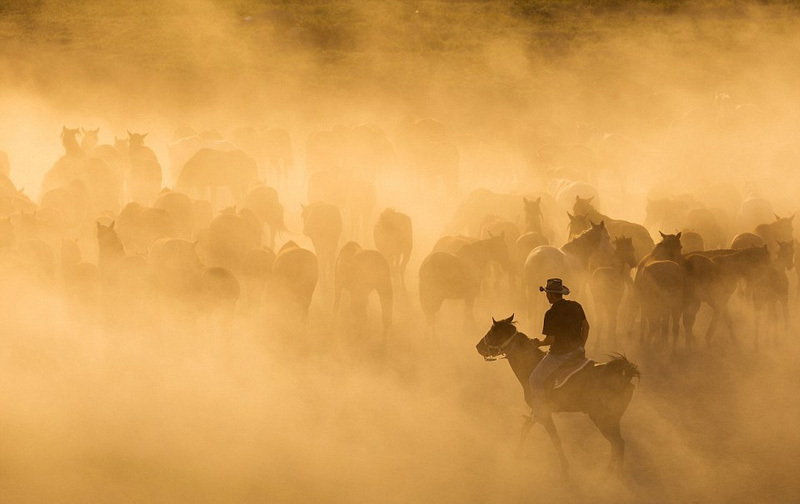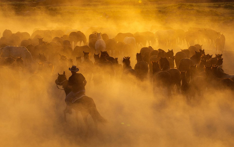 图片中,一名牛仔在一阵浓浓的飞扬尘土的衬托下,在临近黄昏时,驱赶着50匹马。摄影师说道:“这场景让我联想到了经典的美国西部牛仔影片及其经典传奇人物约翰维恩。”
