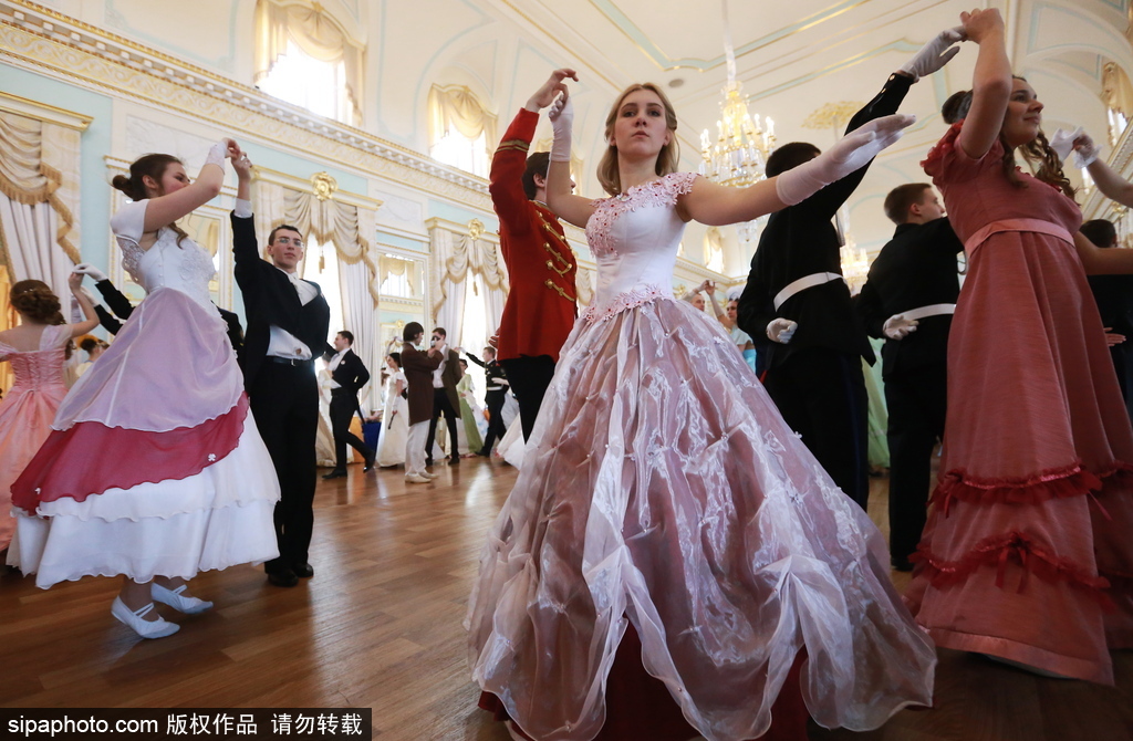 当地时间2017年3月15日,俄罗斯圣彼得堡,圣彼得堡年轻人在康斯坦丁宫举办复古舞会,重现经典《战争与和平》19世纪场景。