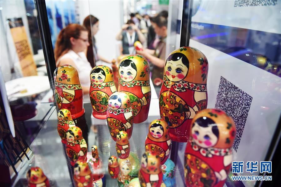 6月15日,在第四届中俄博览会展馆内,参会者在俄罗斯套娃展售区了解情况。