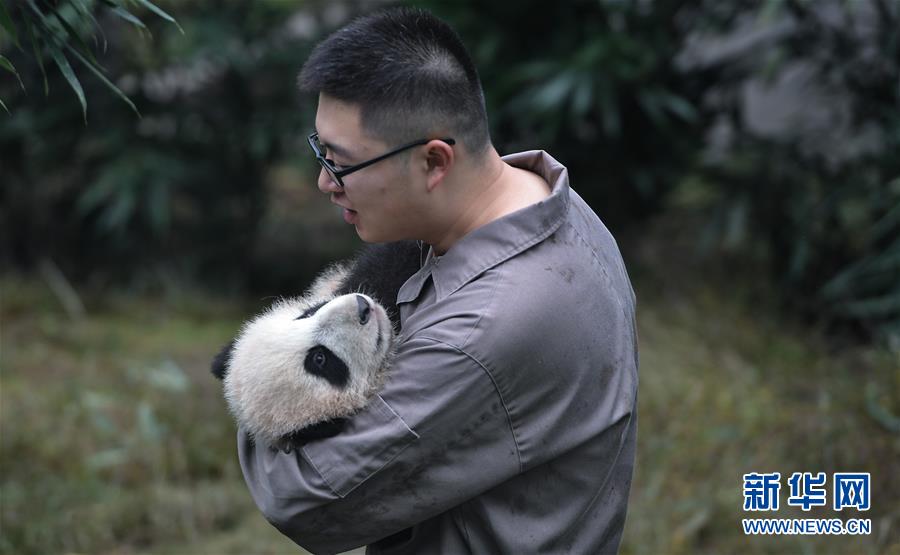 在成都大熊猫繁育研究基地,饲养员与大熊猫宝宝玩耍(9月23日摄)。