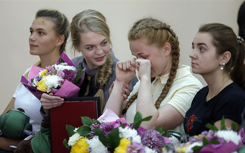 当地时间2017年 9月 23日,俄罗斯克拉斯诺达尔,俄罗斯克拉斯诺达尔高级军事航空学校招收女飞行学员,被录取女飞行学员参加仪式心情激动。