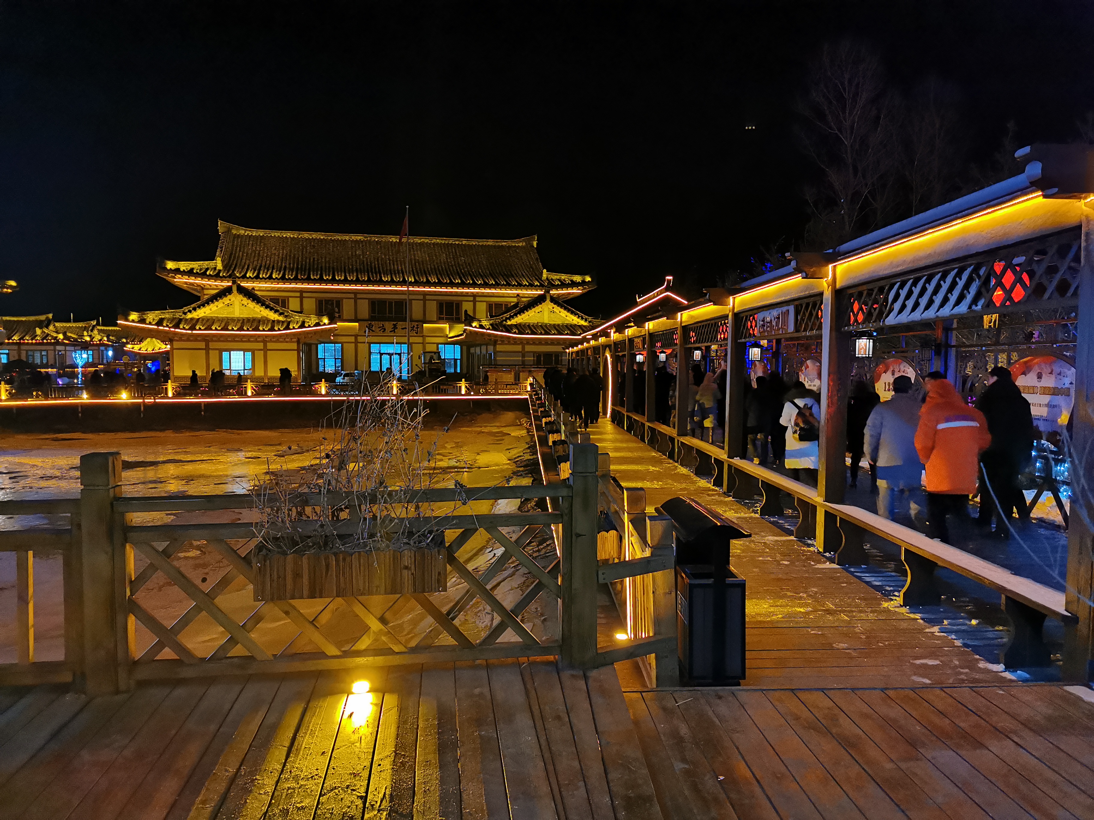 17时许,夜幕降临,防川民俗村霓虹闪烁,在三国交界的山野里格外耀眼。游客们在民俗村的栈道上、美食街上、音乐广场上驻足观看,用相机、手机拍下美好瞬间。在美食街特色餐馆里,游客们推杯换盏,互相祝福。