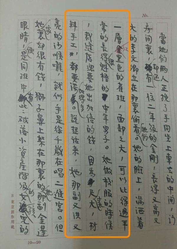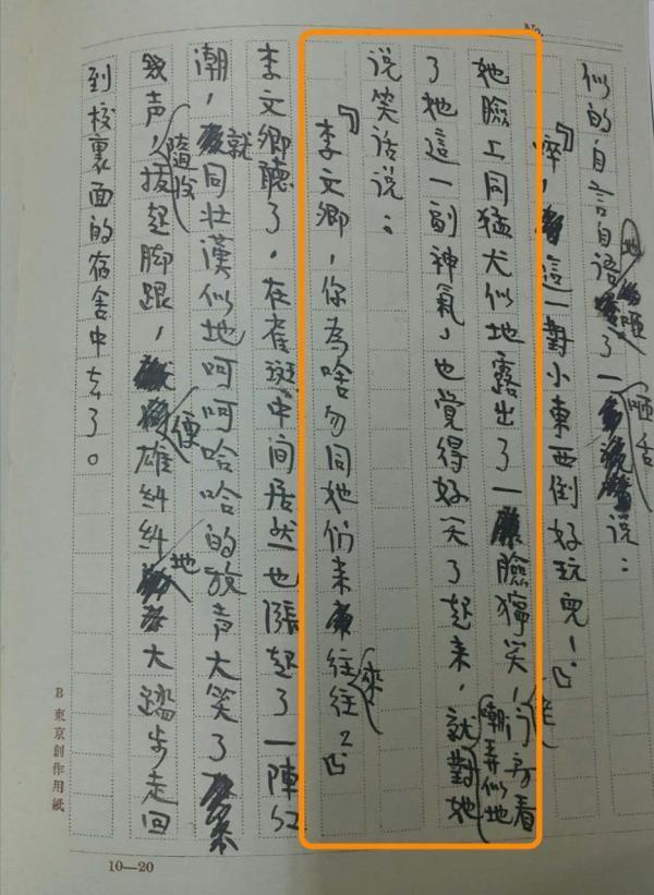 7、【文化典藏】从手稿中可以发现,“金黑色的雀斑”改成了“红黑色”,“魁梧的中年男子”改成了“很魁梧的中年男子”,“都要添多”改成了“都要添加得多",这几处的改动一下子让李文卿的身材壮实了一圈,也更丑陋了一些,为后文她总是强悍似有理的形象做了铺垫。