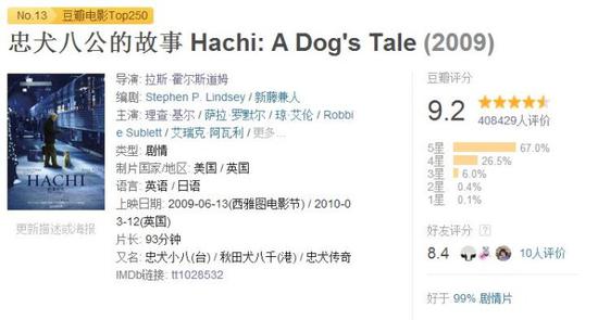 他最为有名的作品就当属《忠犬八公的故事》了,虽然这是将日本 1987 年的《忠犬八公物语》翻拍的,但是却有更好的口碑与传播,当然,原版的也不差,在豆瓣TOP 250 排名 204 ,但和忠犬八公的 40 万看过就只有 4.6万 人看过了。