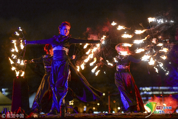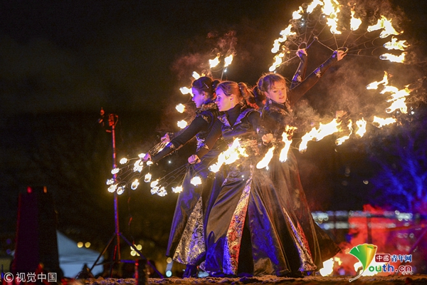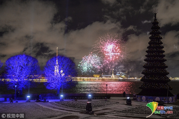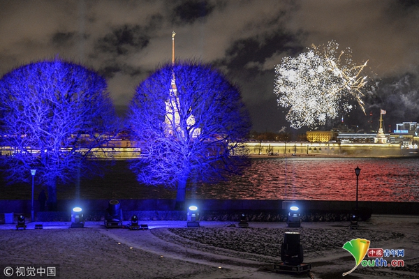 当地时间2018年1月7日,俄罗斯圣彼得堡,当地举行灯光和烟花节,绚丽夺目。