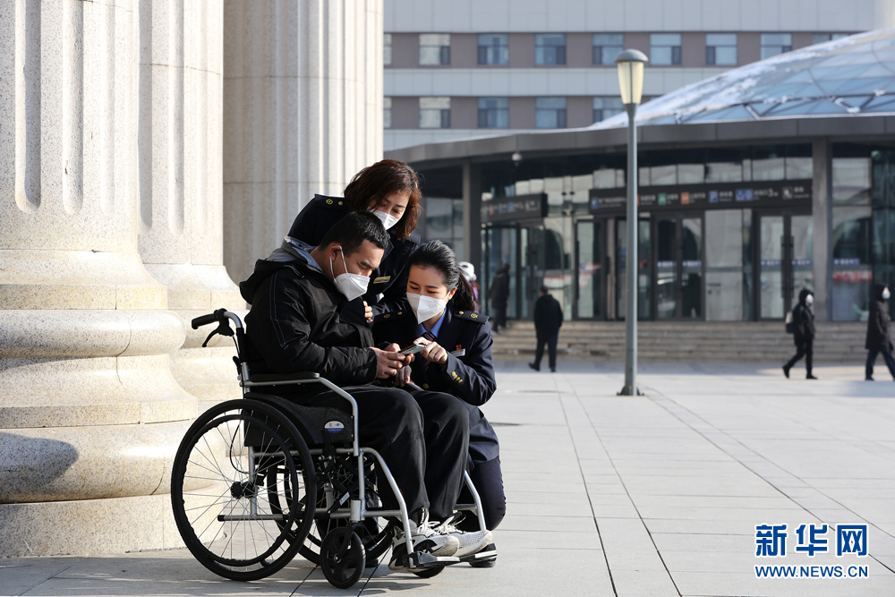 长春火车站“春之约”爱心服务班组成员马丛(右)在帮助乘坐轮椅的旅客