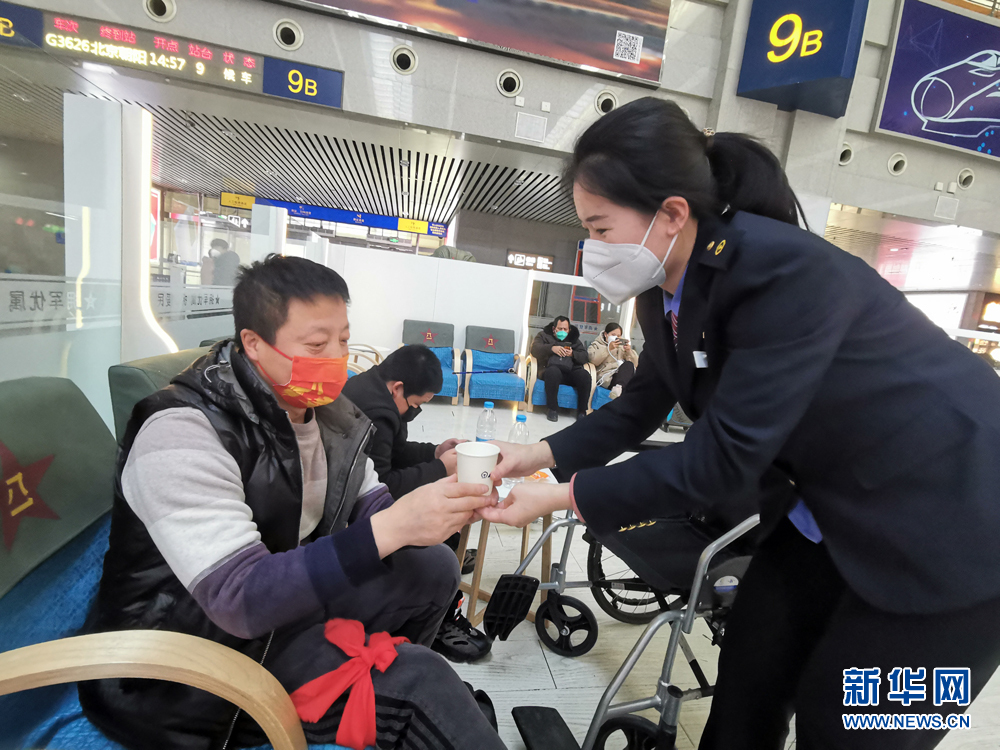 长春火车站“春之约”爱心服务班组成员马丛为旅客送上热水