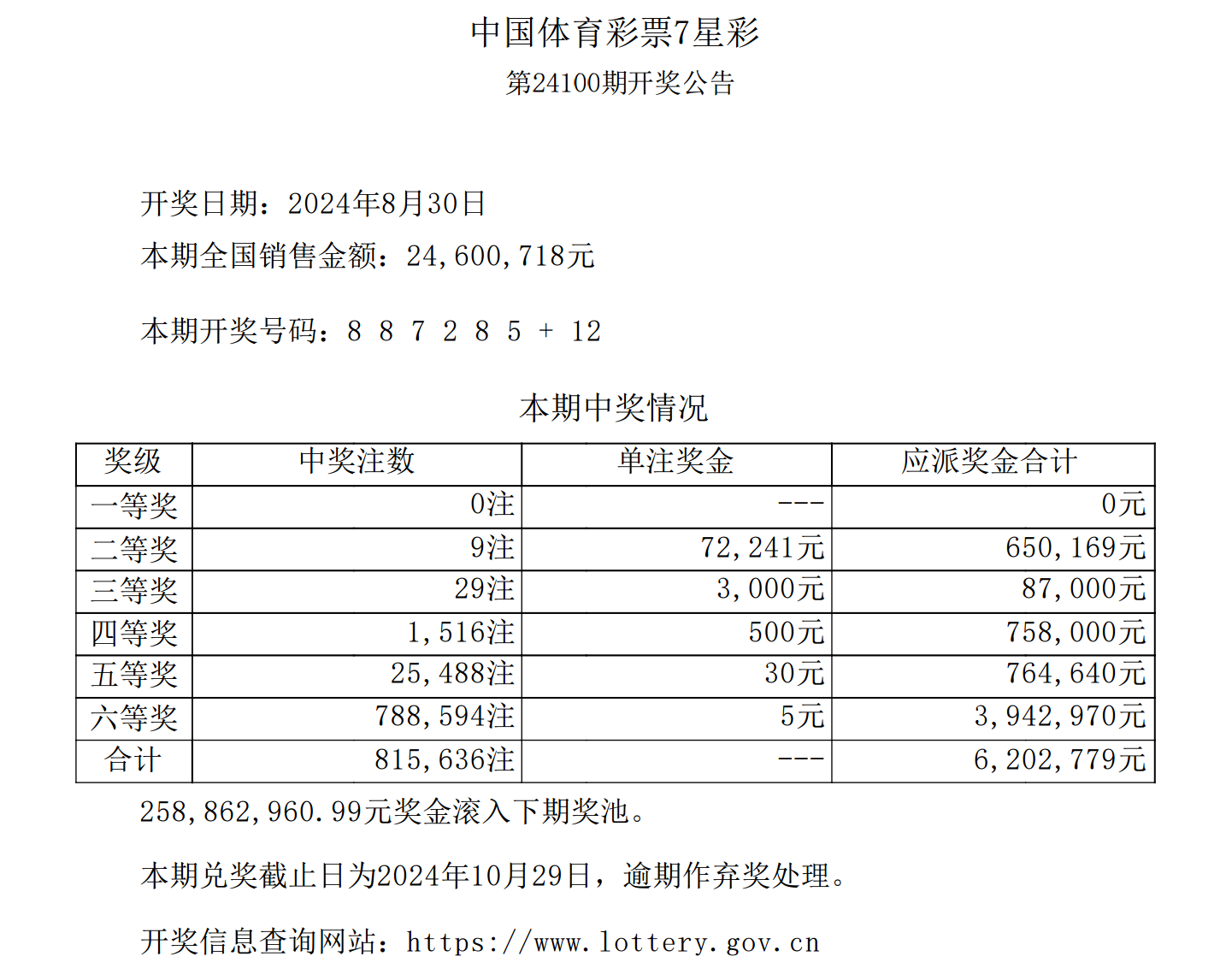 【7星彩】中国体育彩票7星彩第24100期开奖公告