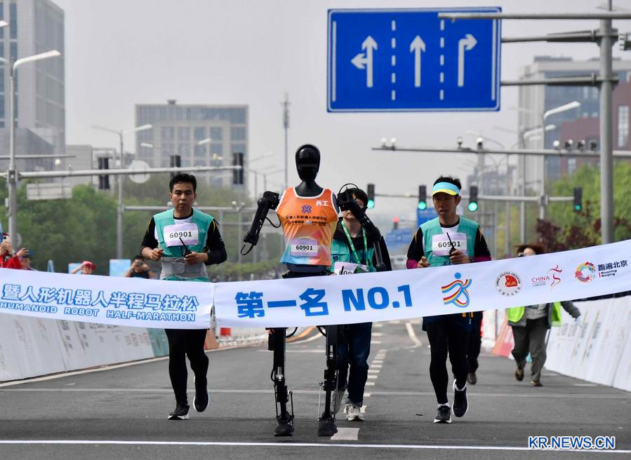 4월 19일 '2025 베이징 이좡(亦庄) 하프마라톤 및 휴머노이드 로봇 하프마라톤'에서 톈궁(天工)팀 선수 '톈궁 울트라(Ultr)'가 결승점을 향해 돌진하고 있다. (사진/신화통신)