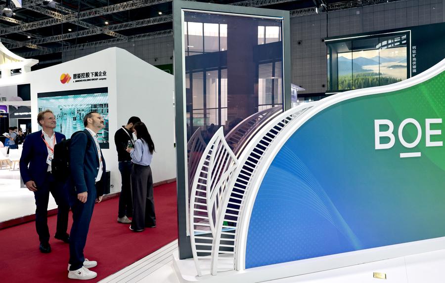 지난달 12일 '제18회 국제 태양광발전∙스마트 에너지 및 에너지 저장∙배터리 기술∙설비 박람회(SNEC PV & ES)'에서 506와트(W) 페로브스카이트 태양광 모듈을 살펴보는 관람객. (사진/신화통신)