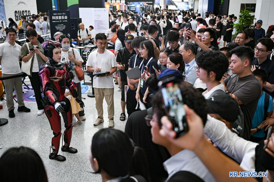 지난 27일 '2025 세계인공지능대회(WAIC)'에서 휴머노이드 로봇을 관람하는 내방객. (사진/신화통신)