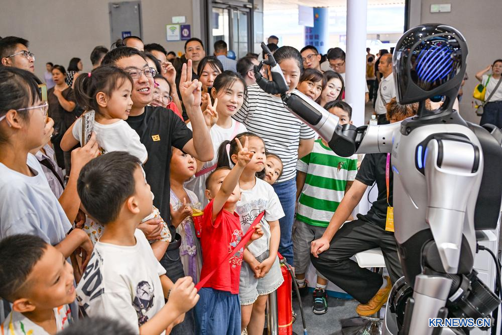 7일 박람회에서 휴머노이드 로봇과 상호작용하는 관람객.