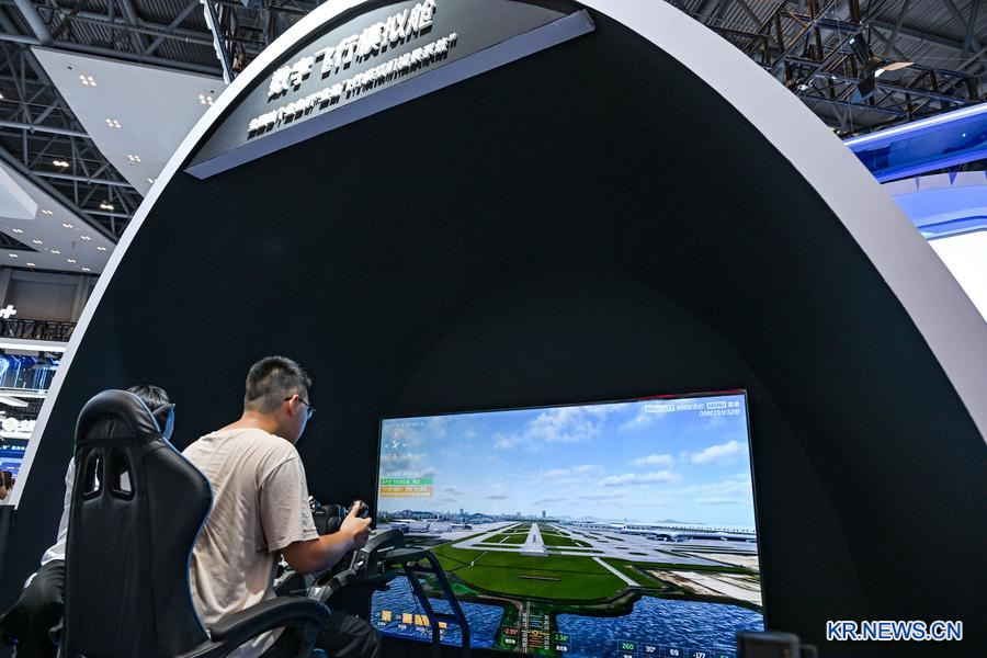5일 '2025 세계스마트산업박람회'를 방문한 관람객이 '디지털 비행 시뮬레이션 캡슐'을 체험하고 있다.