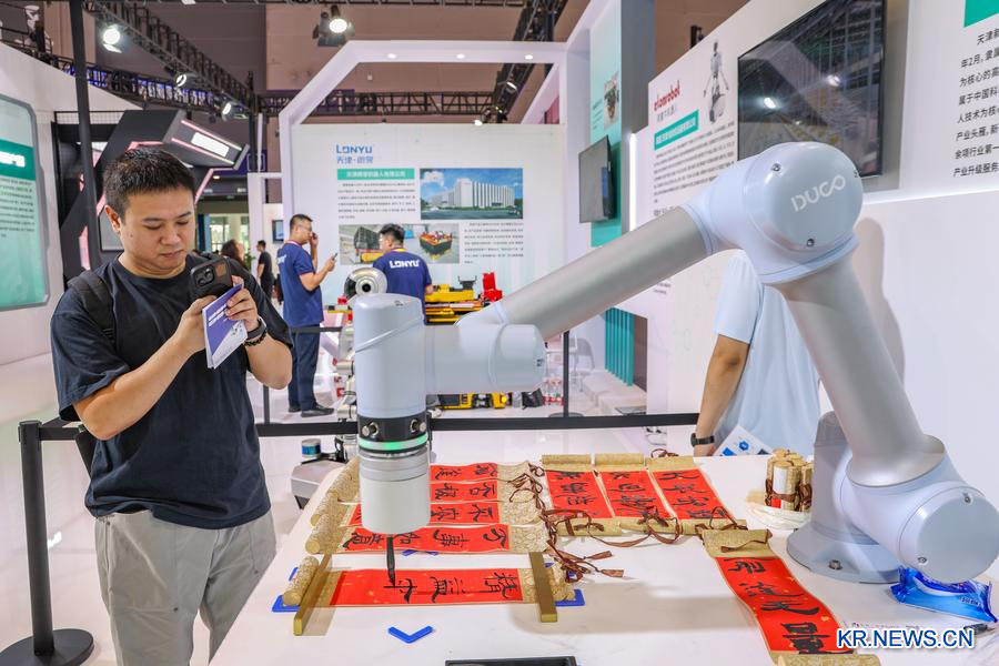 5일 한 관람객이 붓글씨를 쓰는 스마트 로봇을 카메라에 담고 있다.