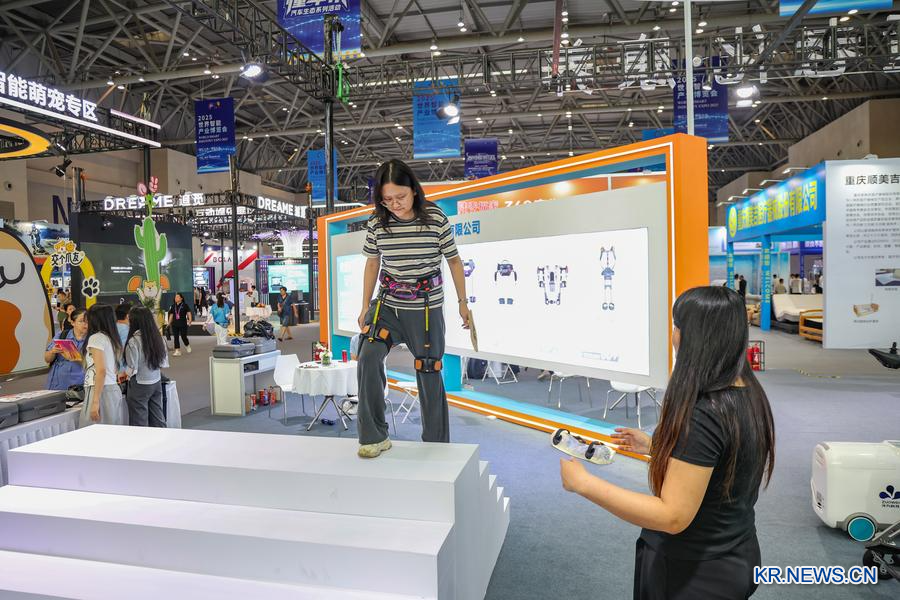 5일 관람객이 '2025 세계스마트산업박람회'에서 외골격 로봇을 체험하고 있다.