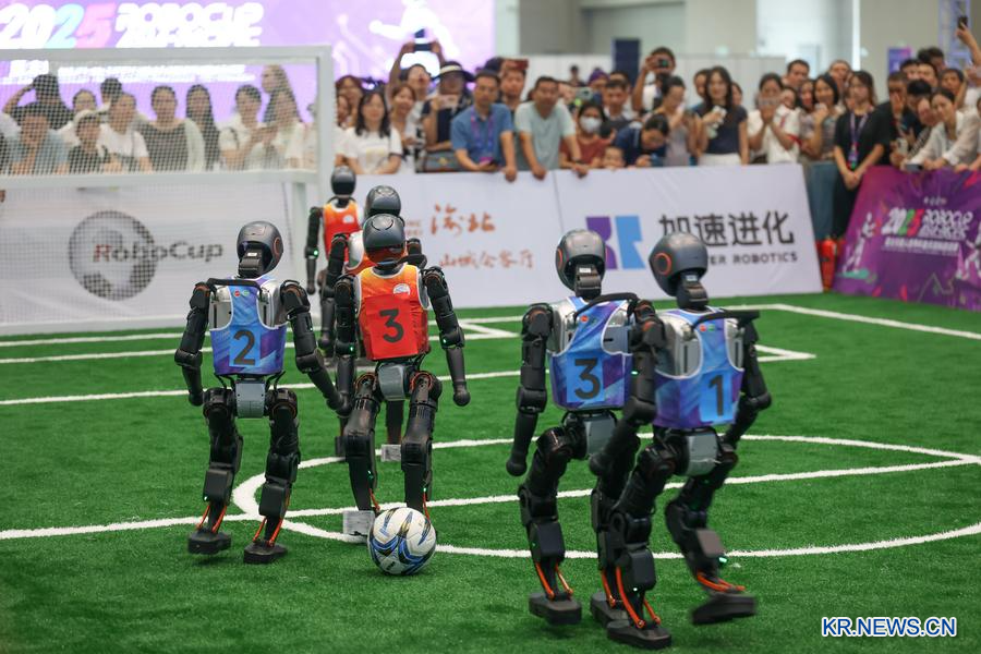 5일 '2025 세계스마트산업박람회'에서 열린 로봇 3대 3 축구 경기.