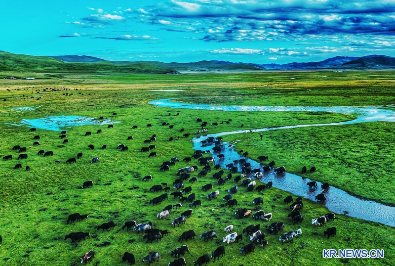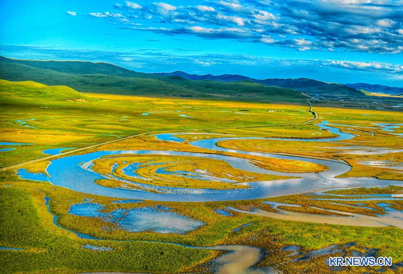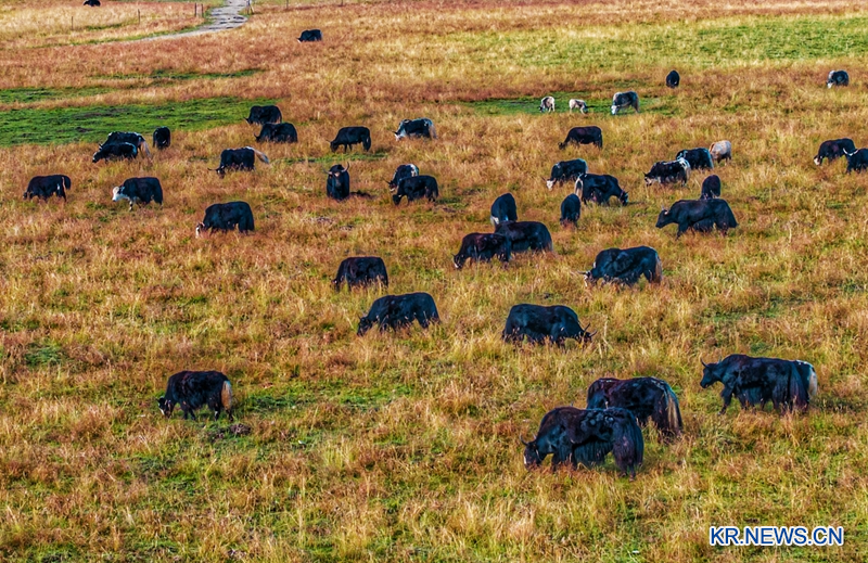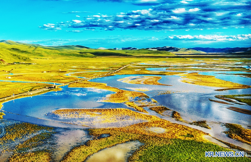초가을에 접어든 쓰촨성 아바짱족챵족자치주 아바(阿坝)현 만쩌탕(漫泽塘)습지대초원이 그림같은 풍경을 뽐내고 있다. 평균 해발이 약 3400m인 만쩌탕(漫泽塘)습지대초원은 촨시베이고원의 우량 목장이다.