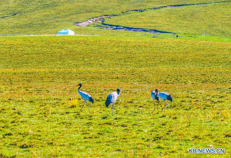 만쩌탕(漫泽塘)습지대초원을 유유자적 거니는 검은목두루미.