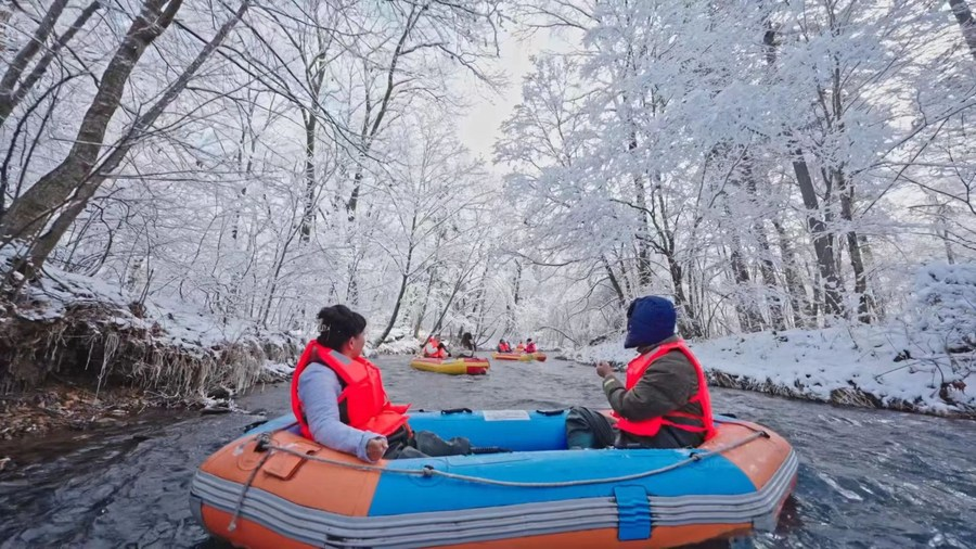 관광객들이 지난 6일 루수이허(露水河)의 한 수렵리조트에서 겨울 래프팅을 체험하고 있다. (자료사진/신화통신)