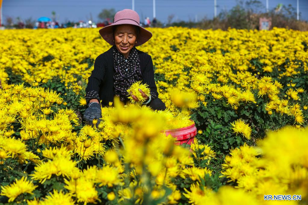 [신화망 신양 11월4일]가을 국화 수확 시기가 다가왔다. 허난(河南)성 신양(信阳)시 리옌완(李堰湾)촌 농민들은 맑은 날씨를 틈타 국화를 따고 가공해 시장에 공급하느라 분주한 나날을 보내고 있다. 리옌완촌 농민이 2일 수확한 금사황국을 바구니에 담고 있다. 2022.11.2