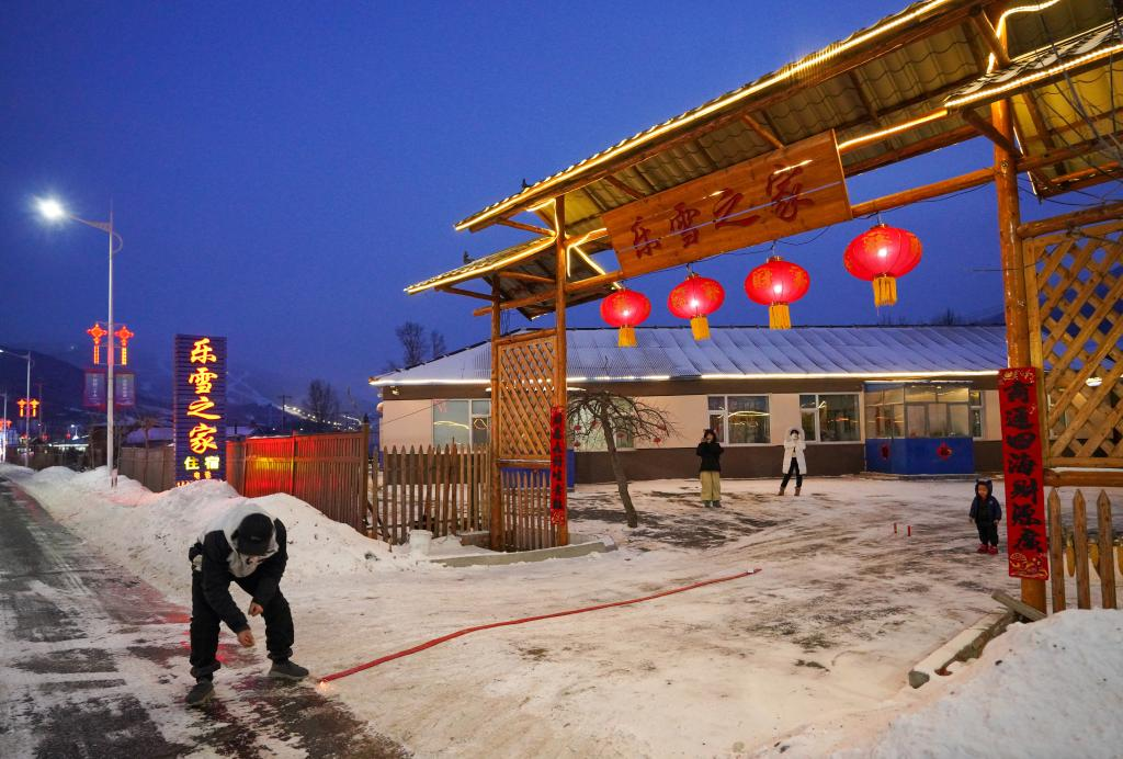 지난 21일 지린시 베이다후(北大湖)진 난거우(南沟)촌의 한 민박집에서 민박집 주인과 손님들이 폭죽을 터뜨리고 있다. (사진/신화통신)