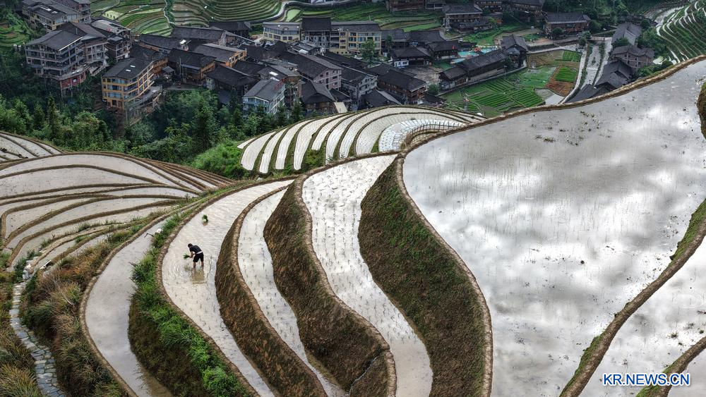 광시(广西)좡족자치구 룽성(龙勝)거(各)족자치현의 계단식 논 관할구역 내 각 마을이 여름 파종 농번기를 맞았다. 마을 주민들은 밭을 갈고 모를 심으며 분주한 모습을 연출했다.