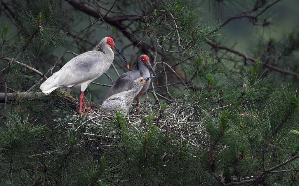 산시(陕西)성 양(洋)현 룽팅(龙亭)진의 한 밀림 속에서 한 쌍의 성체 따오기가 새끼를 지키고 있다. (사진/신화통신)