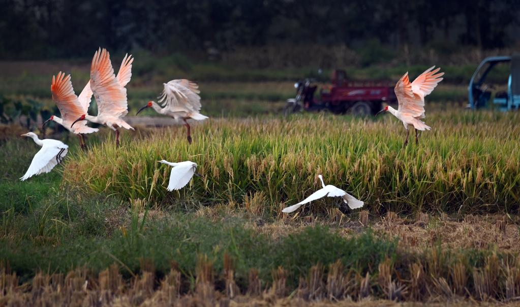 따오기와 백로가 지난 9월 10일 산시 한중(汉中)시의 논 위를 날고 있는 모습. (사진/신화통신)