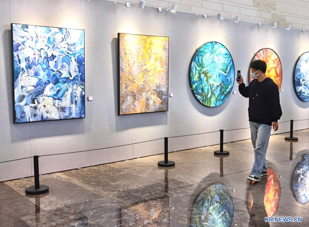 관람객들이 12일 '따오기와 아름다운 조화의 집'이라는 주제로 열린 유화전을 촬영하고 있다. (사진/신화통신)