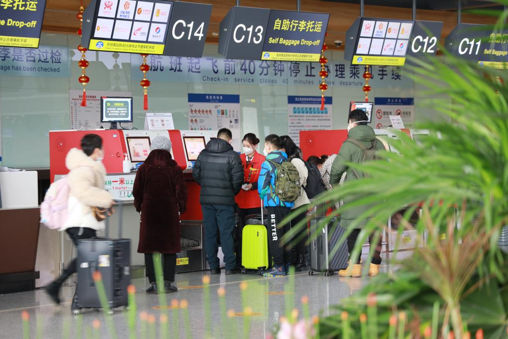 올해 춘윈 기간, 창춘 룽자국제공항에서 여객들이 탑승수속을 밟고 있다. (사진/신화통신)