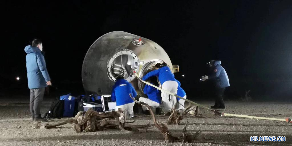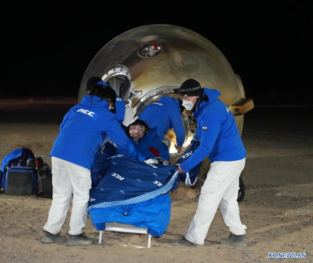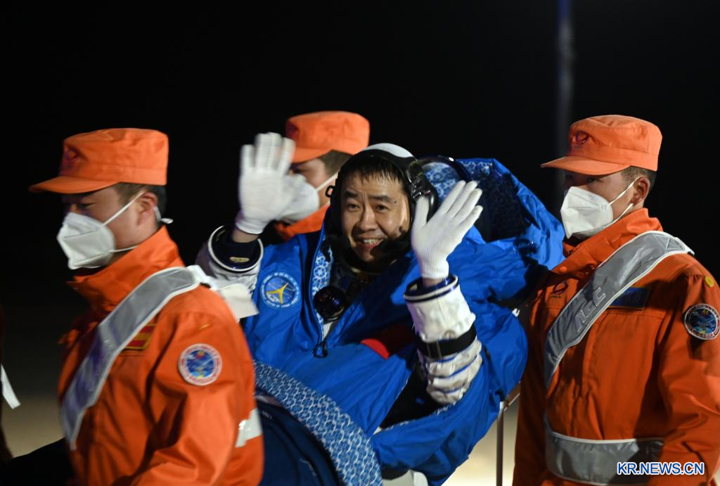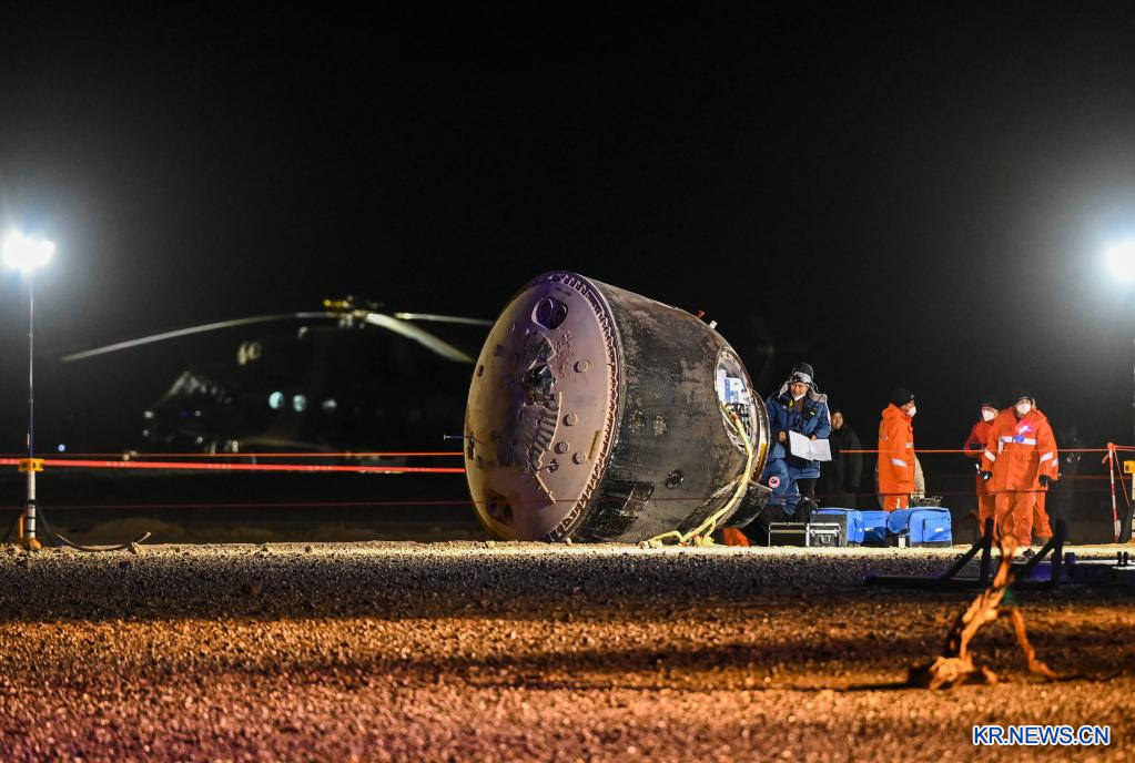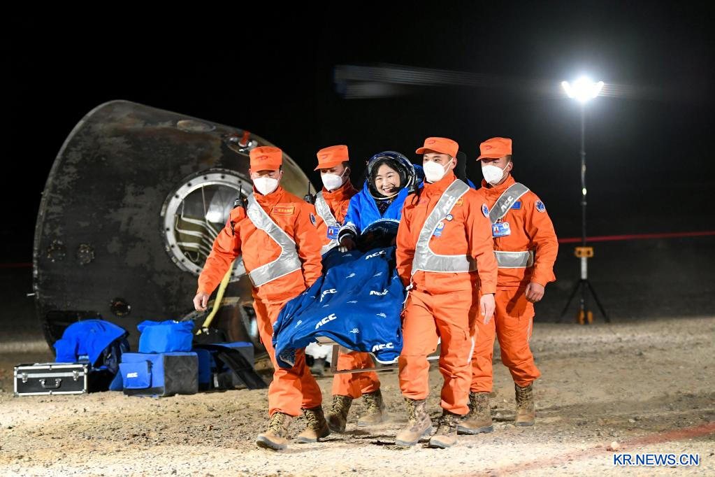 천둥(陈东), 류양(刘洋), 차이쉬저(蔡旭哲) 등 세 명의 우주비행사를 태운 중국 유인우주선 선저우(神舟) 14호 귀환 캡슐이 4일 오후 8시9분께 네이멍구자치구 둥펑(东风) 착륙장에 성공적으로 착륙했다. 우주비행사 세 명의 건강 상태는 양호한 것으로 확인됐으며, 선저우 14호 유인 비행 임무는 원만히 성공했다.[촬영/신화사 기자 리강(李刚)]