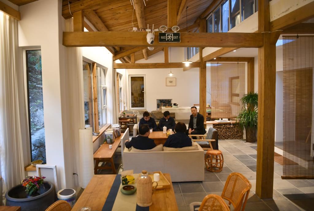 지난해 10월 9일 산시(陕西)성 닝산(宁陕)현의 한 민박을 찾은 관광객들이 로비에서 담소를 나누고 있다. (사진/신화통신)
