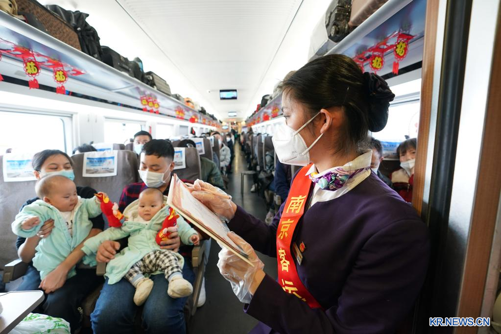 [신화망 난징 1월13일] 11일 D376편 열차에서 승무원이 쌍둥이 아기에게 그림을 그려주고 있다. 이날 중국철로 상하이국그룹 난징(南京)여객운송팀은 D376편 열차에서 '귀성길의 미소' 그림 그리기 이벤트를 진행해 승객들에게 즐거움을 선사했다. 2023.1.11