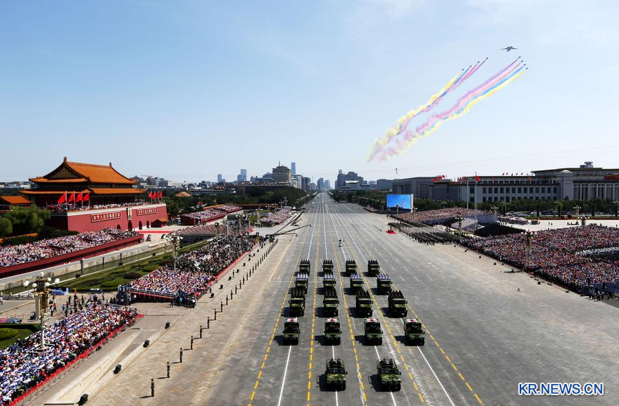 지난 2015년 9월 3일 '중국인민항일전쟁 및 세계반파시스트전쟁 승리 70주년' 기념대회가 베이징에서 거행돼 장비 방진과 공중 비행편대가 톈안먼(天安门) 광장을 통과하고 있다. (사진/신화통신)