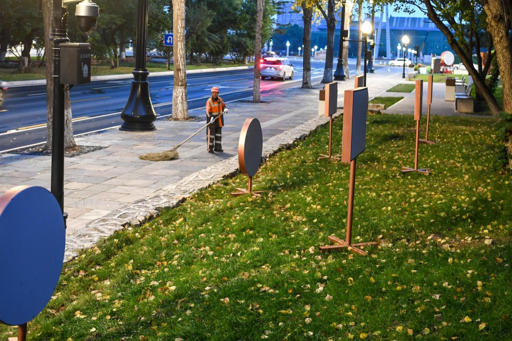10月1日,环卫工人在长春市新民大街清扫公交站台。新华社记者 张楠 摄