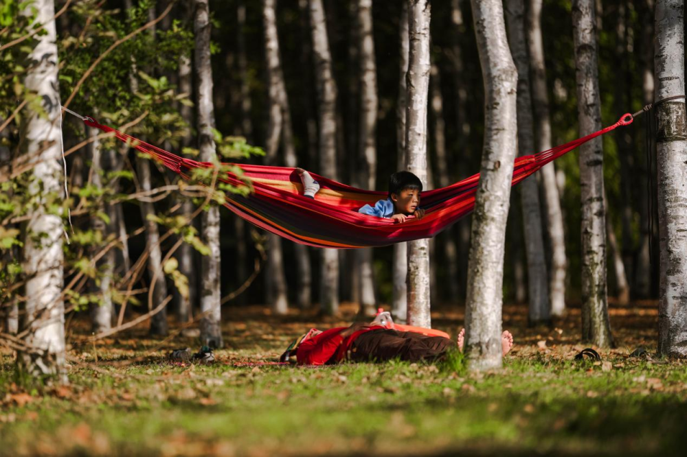 10月6日,一位小朋友与家长在长春市南湖公园白桦林间享受秋日阳光。新华社记者 许畅 摄