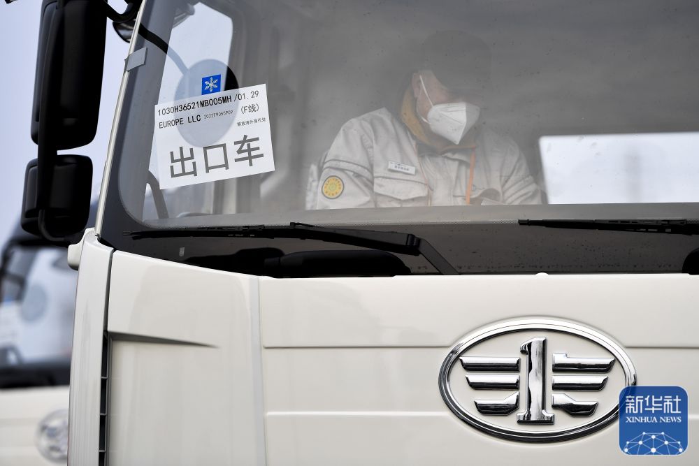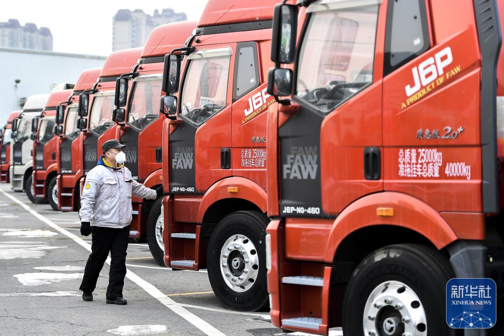 在位于吉林长春的一汽解放智慧物流公司整车物流部停车场,员工对即将转运交付的车辆进行巡检(1月31日摄)。