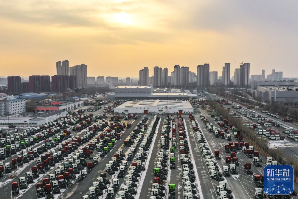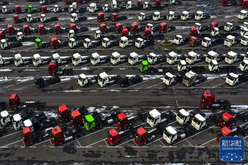 这是1月31日在吉林长春拍摄的一汽解放智慧物流公司整车物流部停车场内即将转运交付的车辆(无人机照片)。